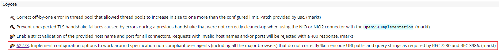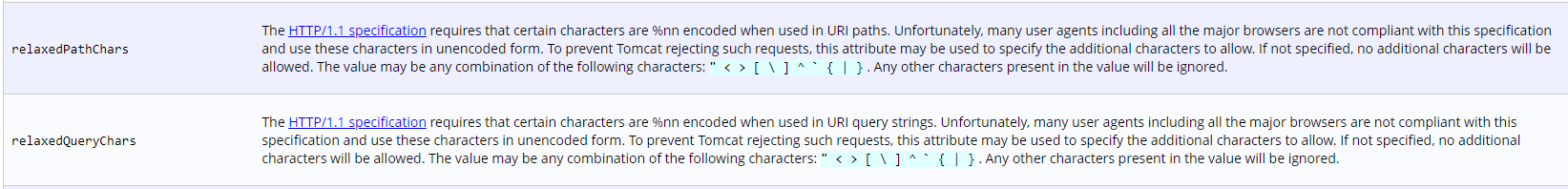 해당 설정의 경우 server.xml의 connect에 설정을 하면되는데, 패치로 인해 막힌 특수문자에 대한 설정을 풀어주는 옵션이다. 아래이미지는 해당옵션에 대한 설명이다.