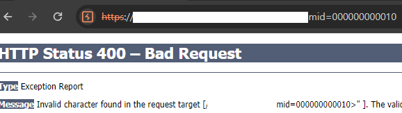 tomcat의 8.5.31 , 9.0.8 버젼 이상부터는 위 패치로 인해 URL 파라미터에 특수문자가 들어갈 경우 웹애플리케이션으로 REQUEST를 전달을 하지 않게끔 패치가 되었다. web.xml의 에러페이지의 경우 웹애플리케이션이 처리할 때의 에러페이지를 나타내므로, tomcat 자체에서 에러를 리턴할 경우 기본 페이지가 노출되는 것으로 확인할 수 있다.
