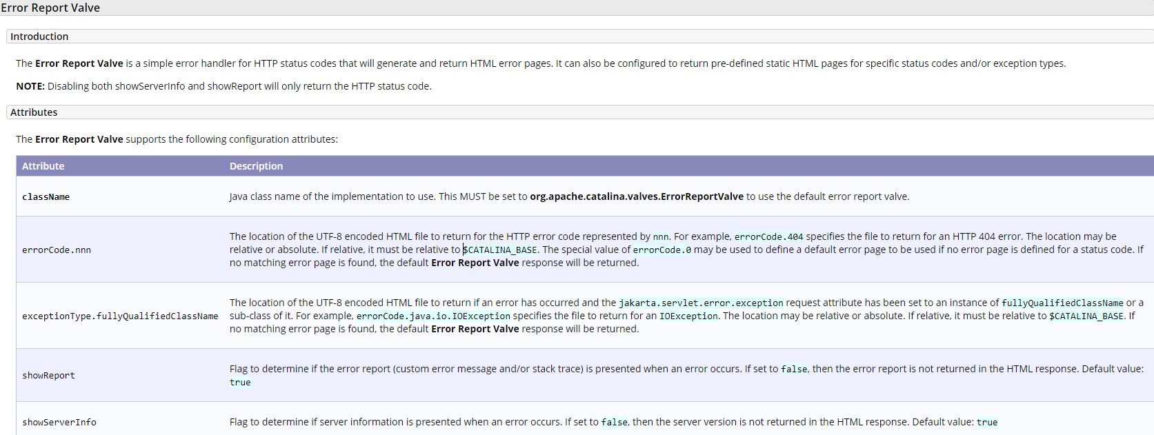 <Valve className="org.apache.catalina.valves.ErrorReportValve"