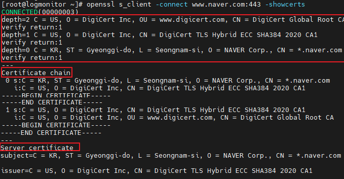 openssl -showcerts 옵션은 서버측에서 보내는 인증서를 보는 옵션이다.